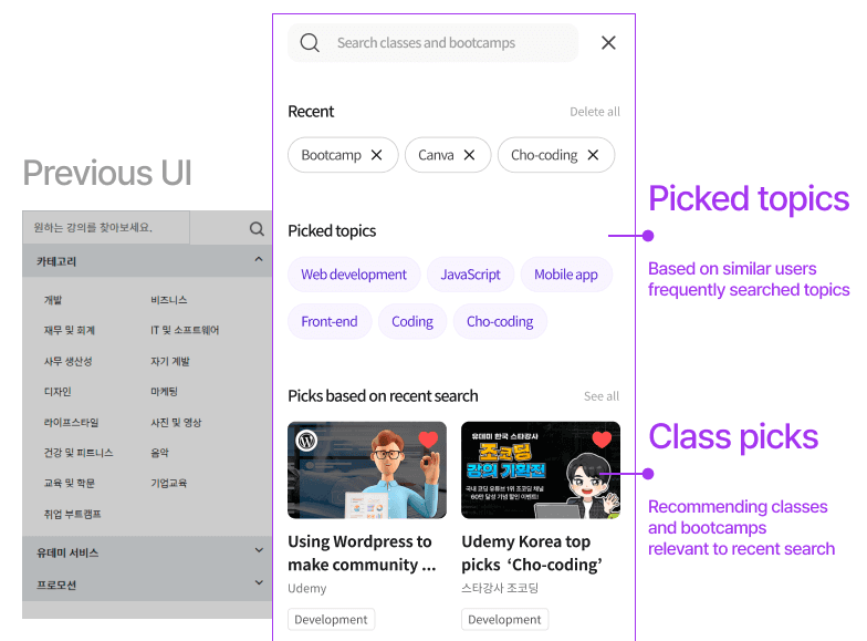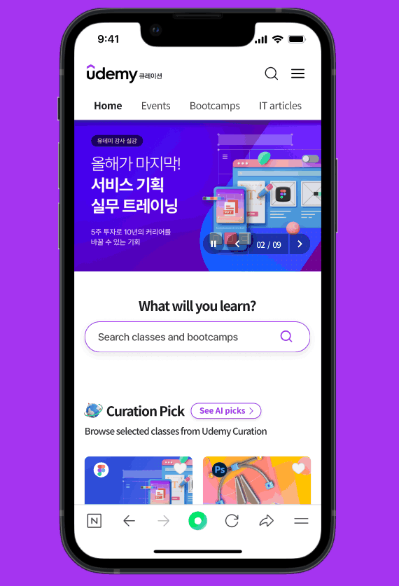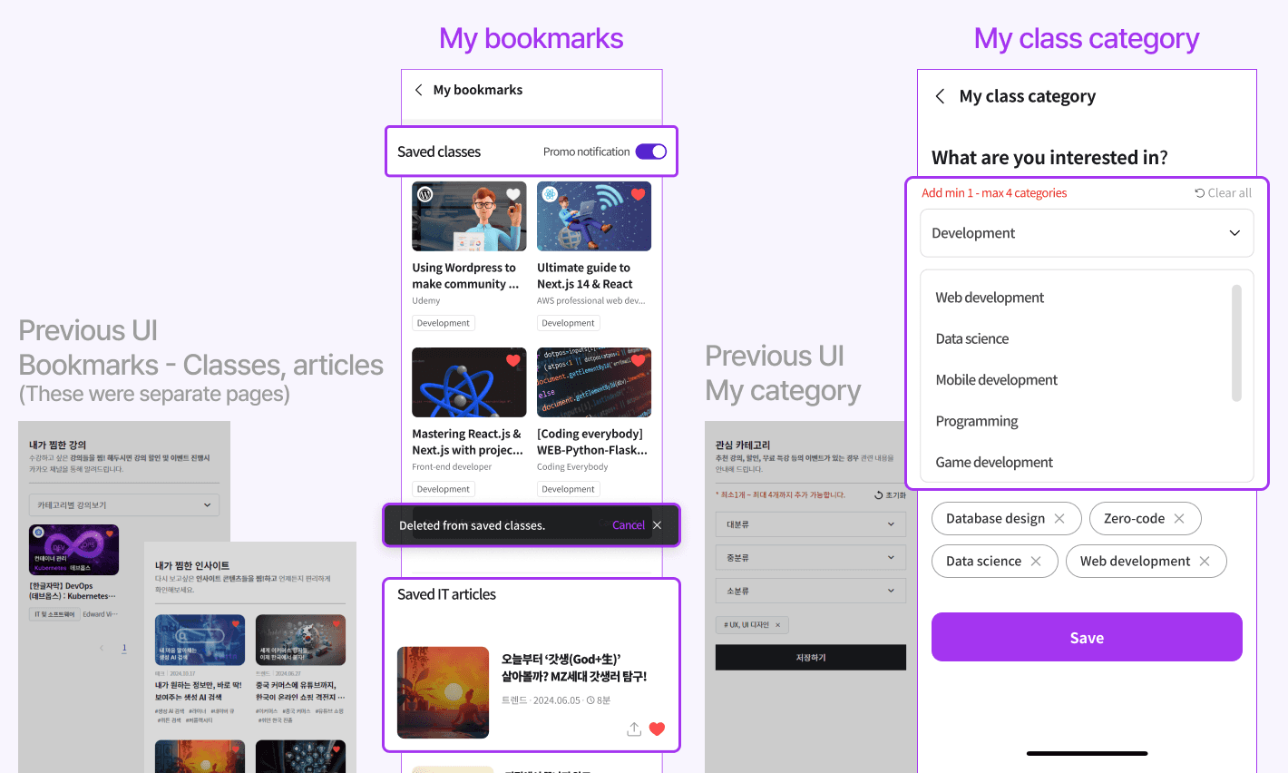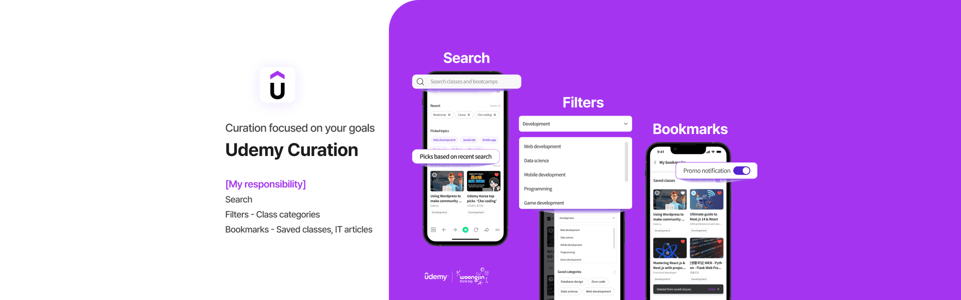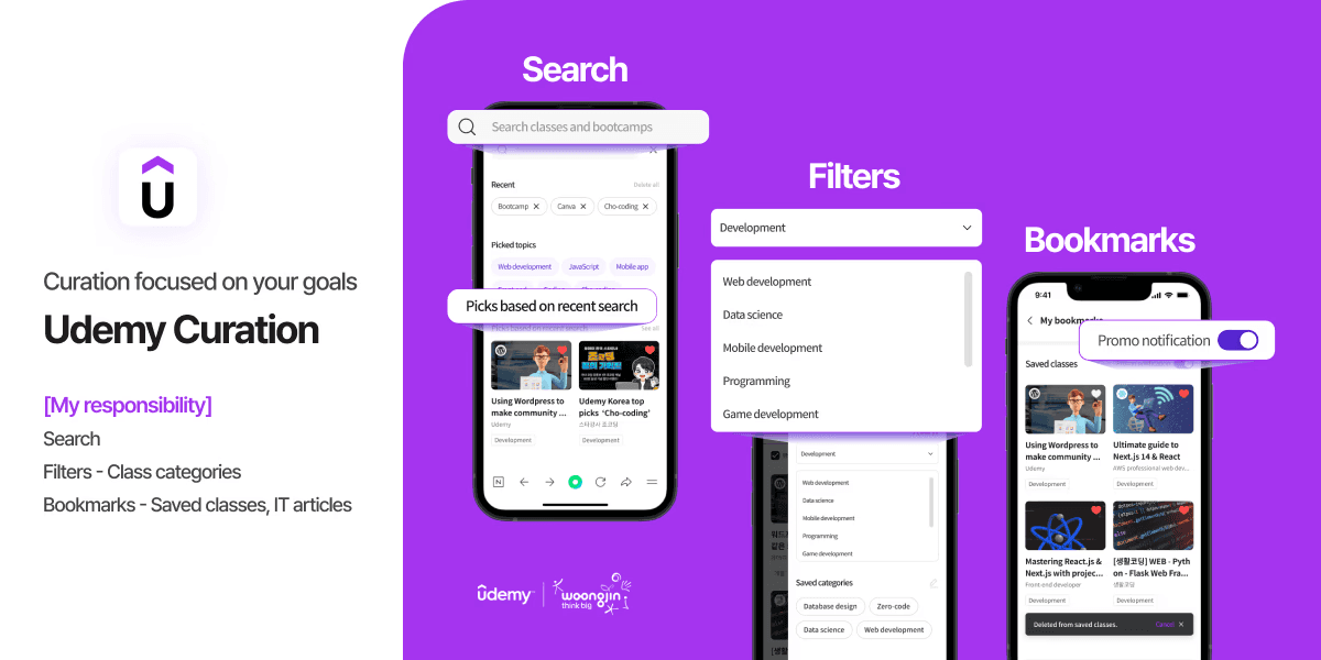As a UX Designer, I took responsibility in enhancing the UI of the search and bookmark pages for better class search experience for online learners who are trying to find useful classes and bootcamps on Udemy Curation.