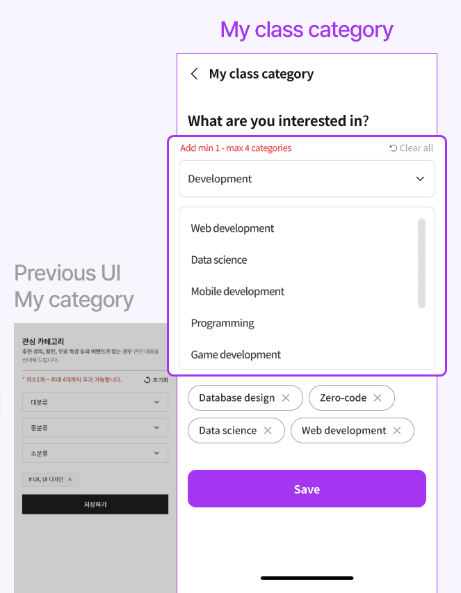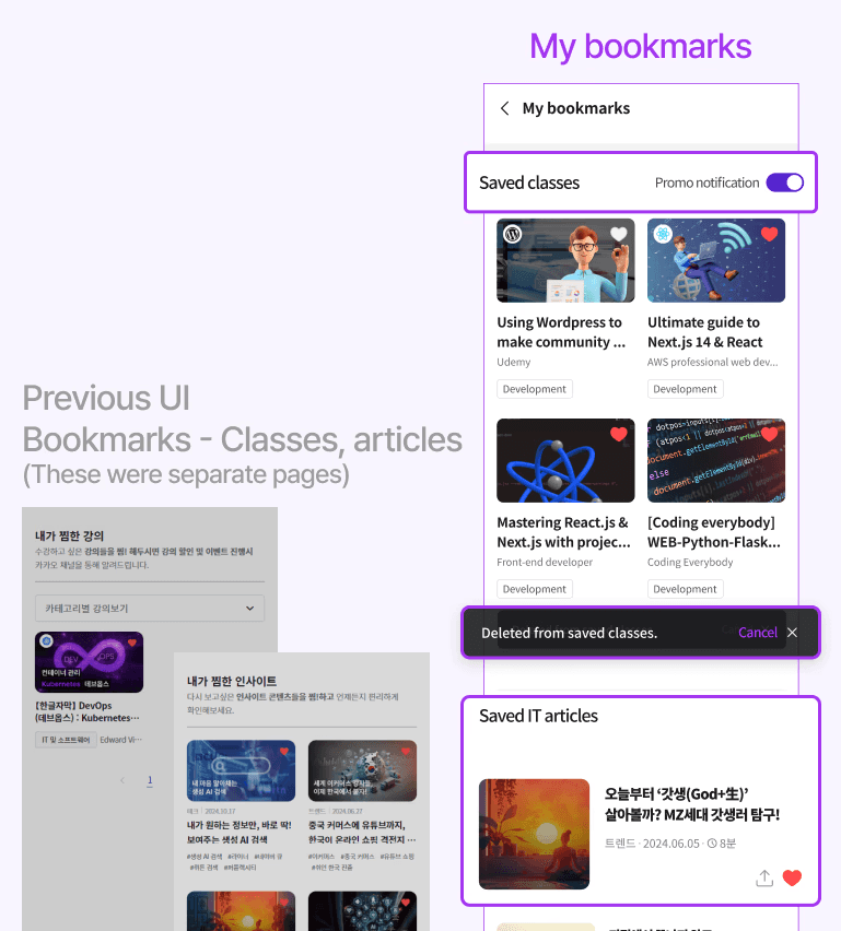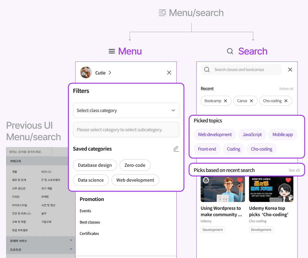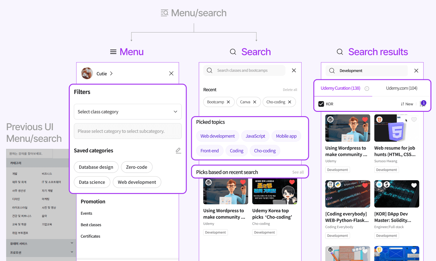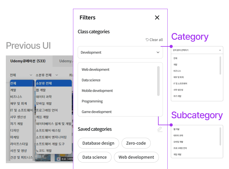 As a UX Designer, I took responsibility in enhancing the UI of the search and bookmark pages for better class search experience for online learners who are trying to find useful classes and bootcamps on Udemy Curation.